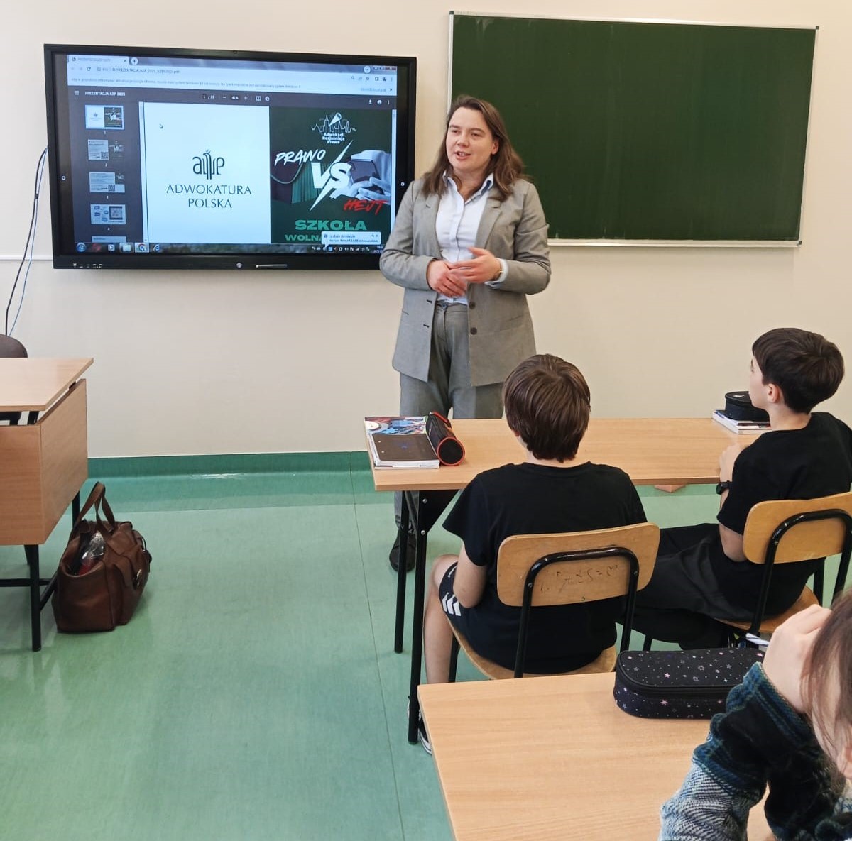 17 listopada naszą szkołę odwiedziła Pani Maria Świniuch, przedstawiciel Okręgowej Rady Adwokackiej w Rzeszowie, która poprowadziła wyjątkowe warsztaty profilaktyczne dla uczniów klas 5–8. Spotkanie odbyło się w ramach IV edycji ogólnopolskiej akcji edukacyjnej „Adwokaci rozjaśniają prawo”.