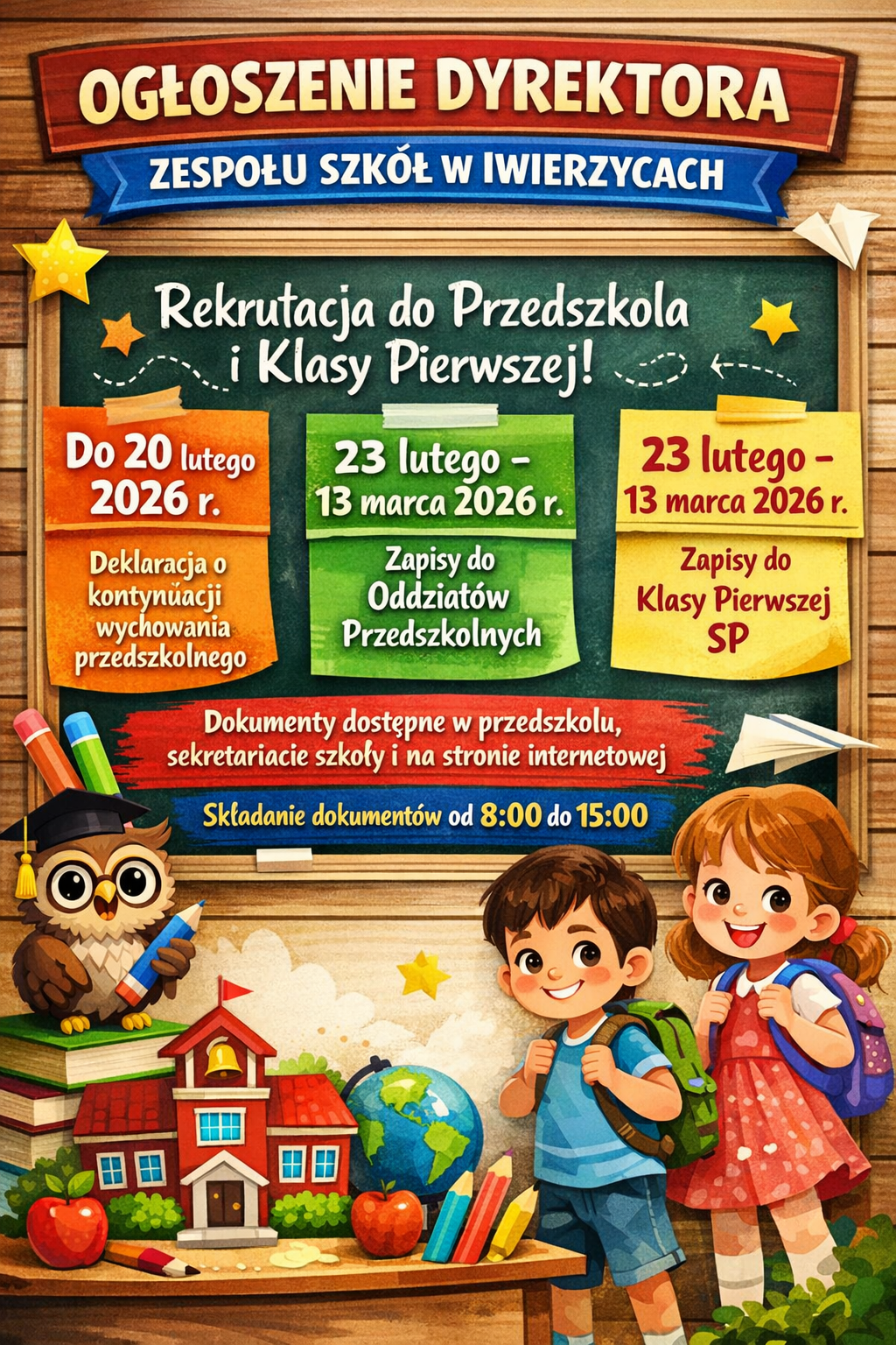 Dyrektor Zespołu Szkół w Iwierzycach informuje, że zgodnie z Zarządzeniem Wójta Gminy Iwierzyce z dnia 20.01.2026 r. w sprawie harmonogramu czynności w postępowaniu rekrutacyjnym oraz składania dokumentów zapisu do oddziałów przedszkolnych w Publicznym Przedszkolu w Iwierzycach i klasy pierwszej Szkoły Podstawowej im. mjr. H. Sucharskiego w Iwierzycach ustala się terminy postępowania rekrutacyjnego:
