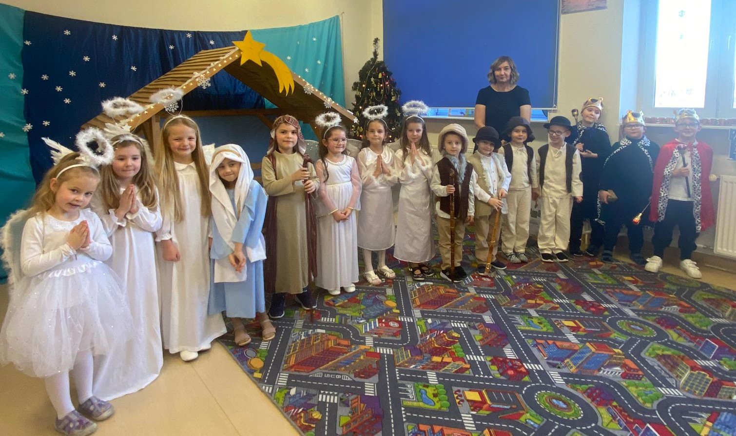 W naszym przedszkolu odbyły się wyjątkowe jasełka przygotowane przez sześciolatki, pod czujnym i pełnym serca okiem Pani Reni Zatorskiej. Mali artyści z ogromnym zaangażowaniem zaprezentowali bożonarodzeniową historię, wzruszając wszystkich zgromadzonych gości.