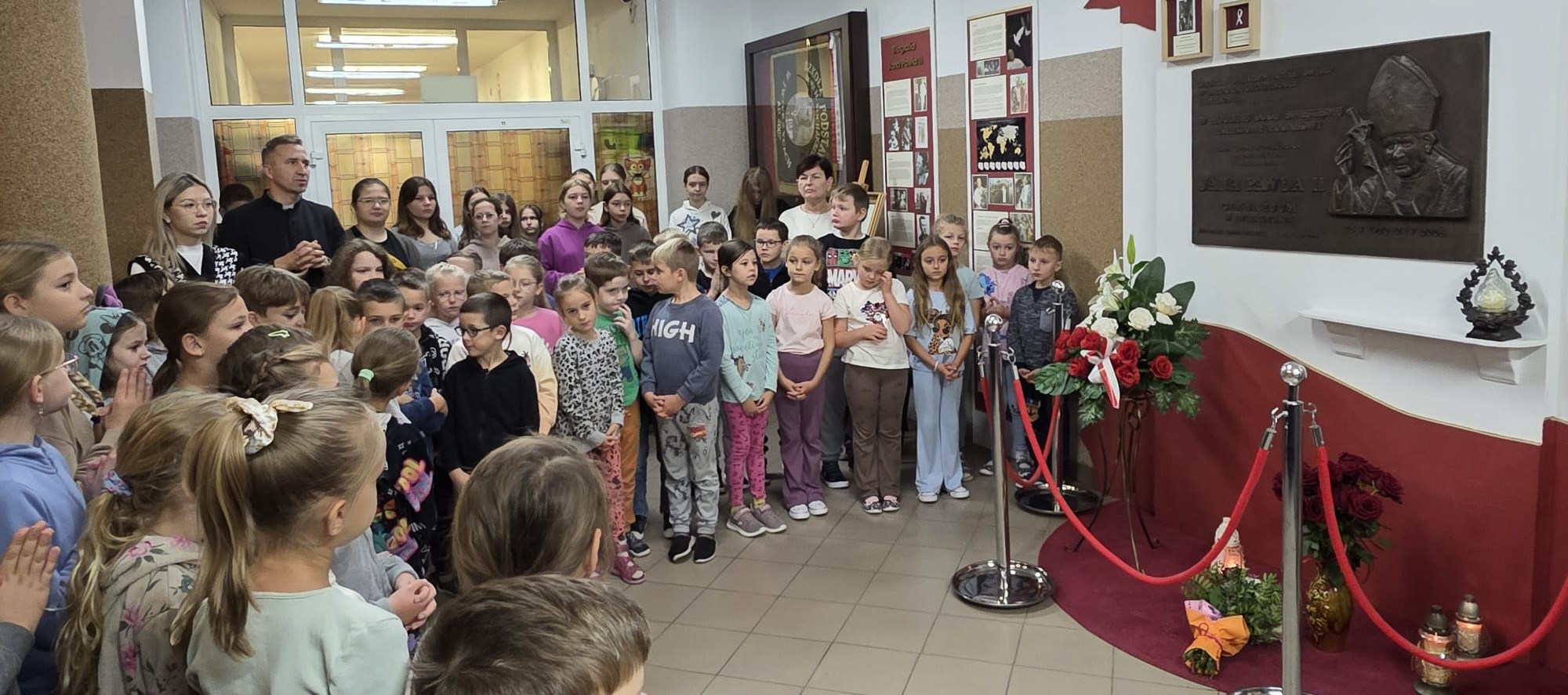 Uroczystość rozpoczęliśmy wspólnym spotkaniem całej społeczności szkolnej pod tablicą pamiątkową Św. Jana Pawła II. Pod przewodnictwem naszego księdza Zbigniewa Lubasa odmówiliśmy modlitwę w intencji Ojca Świętego, złożyliśmy kwiaty i znicze, a następnie wspólnie odśpiewaliśmy jego ulubioną pieśń – „Barkę”. To był piękny, wzruszający moment, który przypomniał nam o wartościach, jakie Jan Paweł II zostawił w sercach każdego z nas.