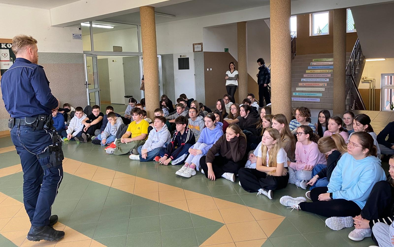 Pan aspirant Rafał Śliwa przypomniał uczniom podstawowe zasady bezpiecznego użytkowania hulajnóg i poruszania się po drogach, zwracając uwagę na zachowania, które mogą uchronić przed niebezpiecznymi sytuacjami.
