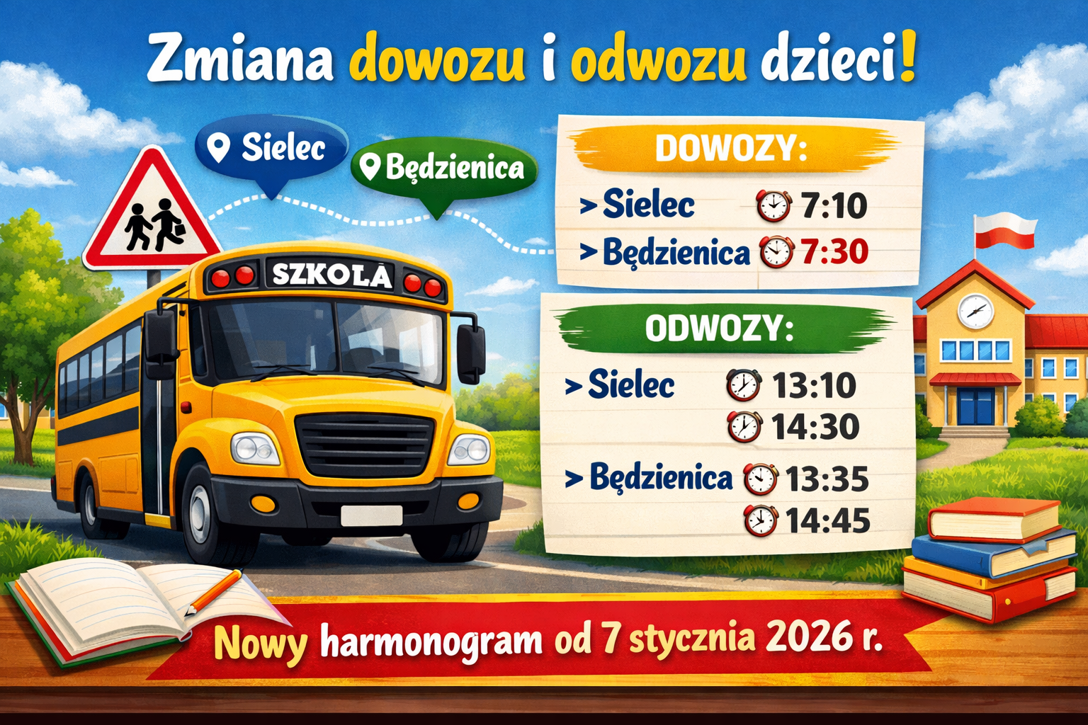 5. Godziny przywozów i odwozów uczniów do Będzienicy i Sielca pozostają bez zmian. W autobusach uczniów obowiązują maseczki.